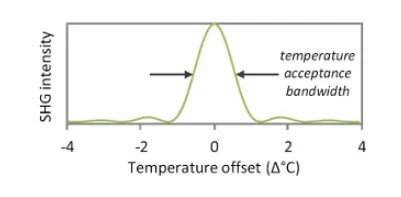 En muchos casos, la eficiencia de la interacción no lineal es muy sensible a <1 °C. Por ejemplo, para un SHG con una p µm de 1064 nm en un cristal de 20 mm de longitud, el ancho de banda de aceptación de temperatura es de ~1 °C. Por lo tanto, si la temperatura difiere 0,5 °C de la temperatura óptima de coincidencia de fase µm , la potencia del SHG es un 50 % inferior a la óptima µm . Si la temperatura del cristal se mantiene en la temperatura óptima de coincidencia de fase en µm con una tolerancia de +/- 0,1 °C, la potencia del SHG se estabiliza con una tolerancia del 2-3 %.
