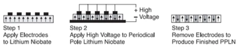 Para fabricar PPLN, se modela litográficamente una oblea de niobato de litio µm con una estructura de electrodo periódico. Esta se coloca debajo de los electrodos y se les aplica un alto voltaje para crear regiones polarizadas periódicamente con la forma deseada. El período de polarización con el que se debe crear el cristal depende de la condición de coincidencia de fase de las longitudes de onda que interactúan en el proceso paramétrico. Las longitudes de onda con coincidencia de fase se pueden adaptar diseñando una PPLN con diferentes períodos de polarización.
