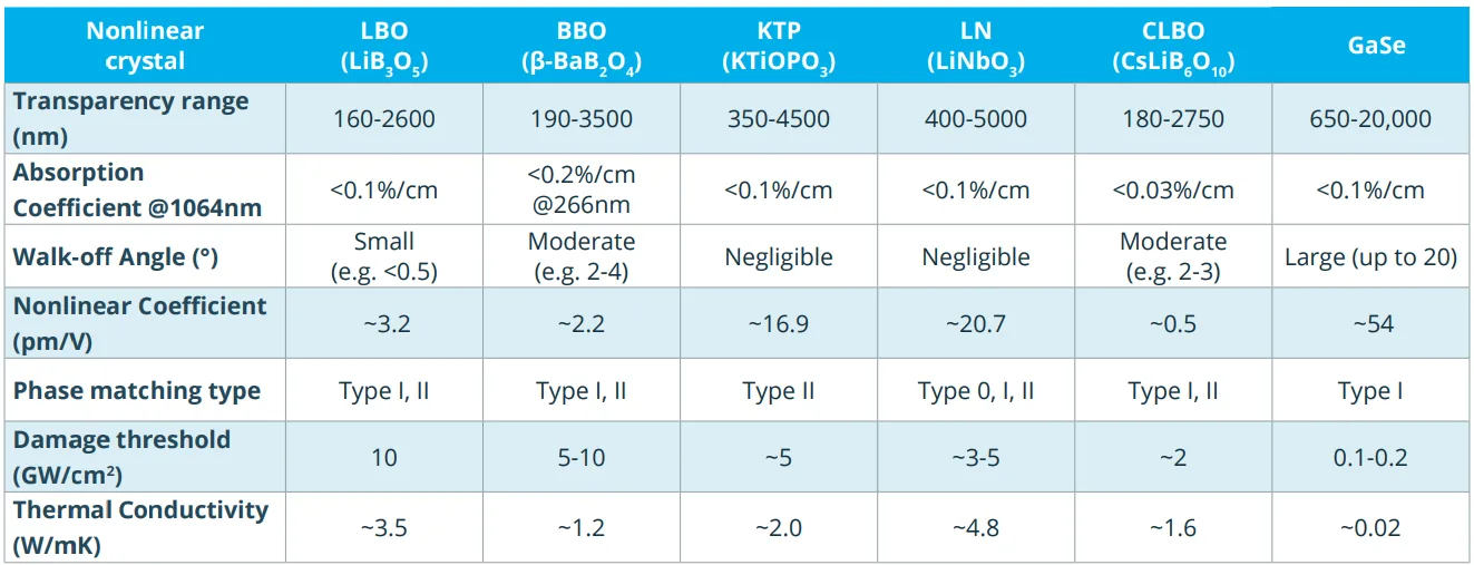 A continuación se muestra una comparación de los cristales no lineales más utilizados en términos de sus propiedades ópticas y no lineales: