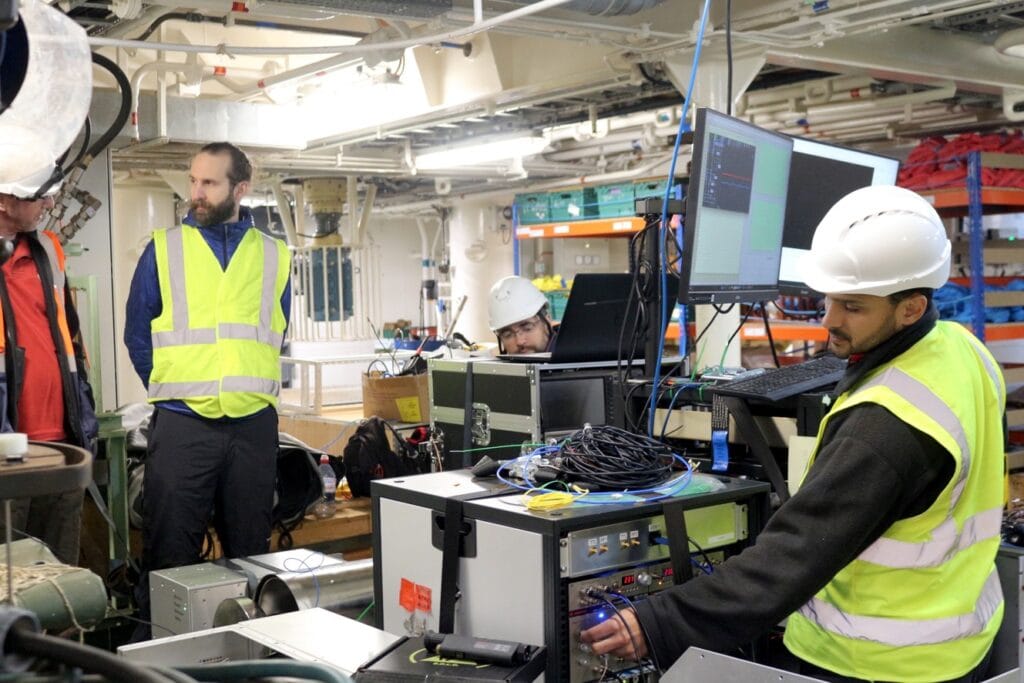 L'équipe d'essai a installé l'accéléromètre HARLEQUIN, deux systèmes laser Harlequin, la source LL2-Rb de Covesion, du matériel de diagnostic et une équipe d'ingénieurs sur le pont intermédiaire du Galatea. Cet espace, habituellement réservé aux outils et aux machines, a été transformé pendant plusieurs jours en un laboratoire flottant µm quantiques.